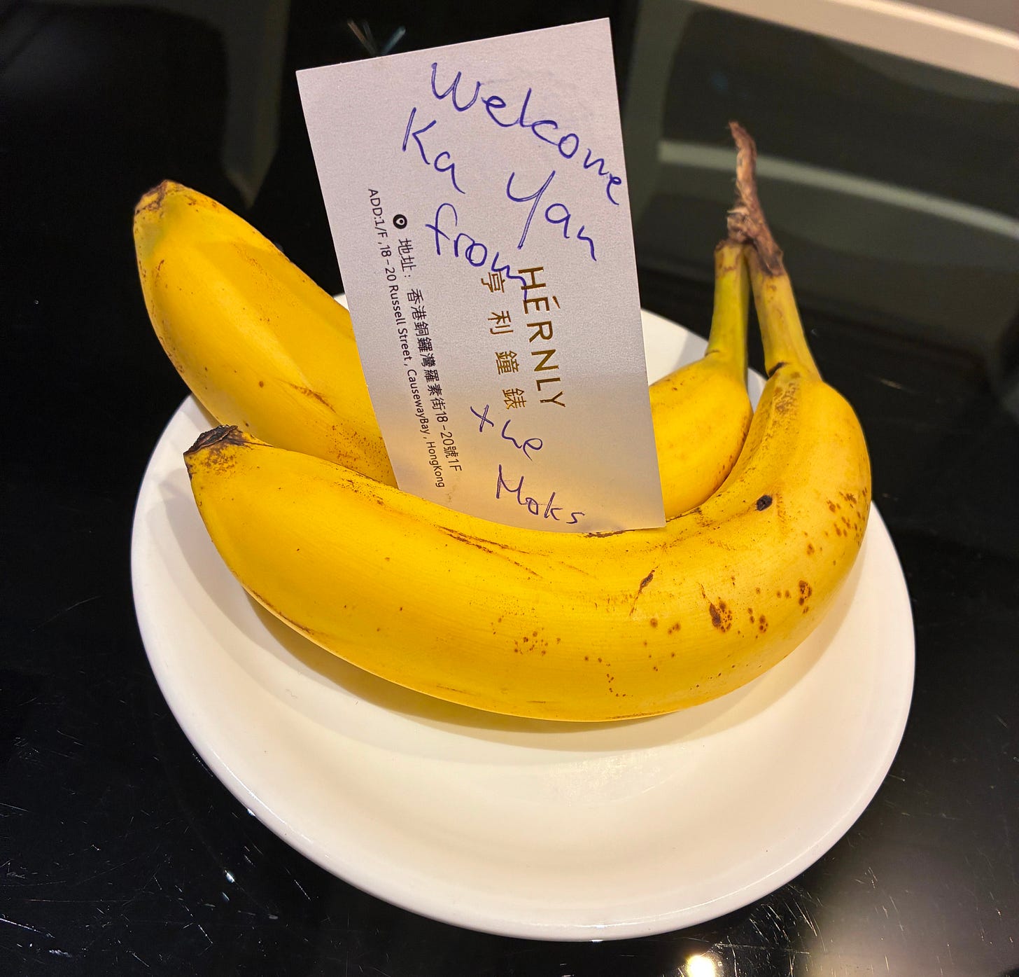 Walked into the place, a welcome note greeted on a business card from a luxurious watch repairing shop, placed between 2 bananas: